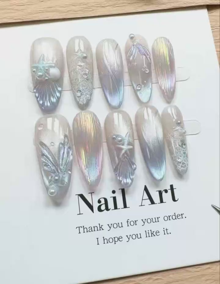 Dive into dreamy ocean vibes with shimmering mermaid press-on nails.